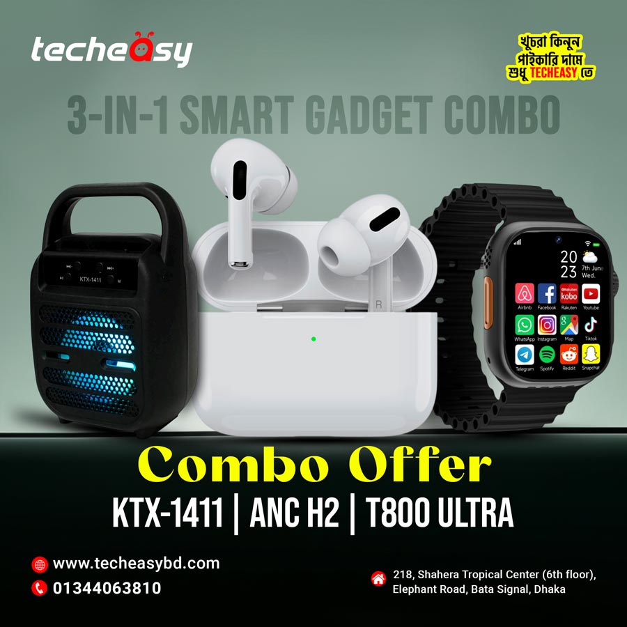 Upgrade your lifestyle with this all-in-one tech combo! Get the KTX-1411 Bluetooth Speaker, ANC H2 Wireless Earbuds, and T800 Ultra Smart Watch in one premium package. Enjoy powerful sound, clear wireless audio, and smart fitness tracking — perfect for daily use, workouts, and entertainment. A complete tech solution at an unbeatable price. Limited stock available!