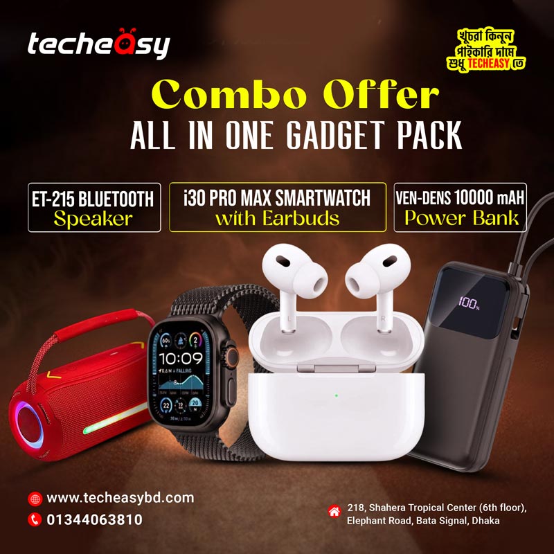 Get the best value with this Combo Offer at only 2999 TK from Techeasy. This bundle includes an ET-215 Bluetooth Speaker, i30 Pro Max Smartwatch with Earbuds, and a VEN-DENS 10000mAh Power Bank. Enjoy powerful sound, smart features, fitness tracking, wireless earbuds, and reliable backup power—all in one affordable package. Perfect for daily use, travel, or gifting. Limited stock available – order now from Techeasy BD.